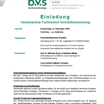 Hinweis: Frühbucherrabatt verlängert bis 07.10.2025! Der Herbst hat Einzug gehalten und damit ist es auch wieder Zeit für das Herbstseminar unseres Fachbereiches Immobilienbewertung (siehe Anlage). Veranstaltungsdetails: Datum/Zeit: Donnerstag, 13. November 2025, 13:00 – 18:00…