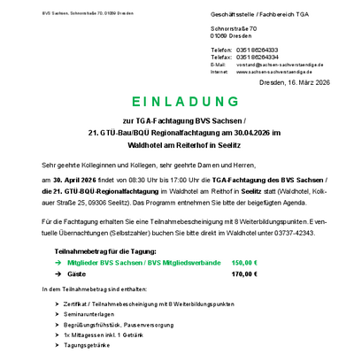Waldhotel am Reiterhof Am 30.04.2026 findet die nächste TGA-Fachtatung des BVS Sachsen im Waldhotel am Reiterhof statt. Es erwartet Sie ein abwechslungsreiches Programm mit kompakten Fachvorträgen, praxisnahen Einblicken sowie ausreichend Gelegenheit zum fachlichen Austausch mit Kolleginnen und…