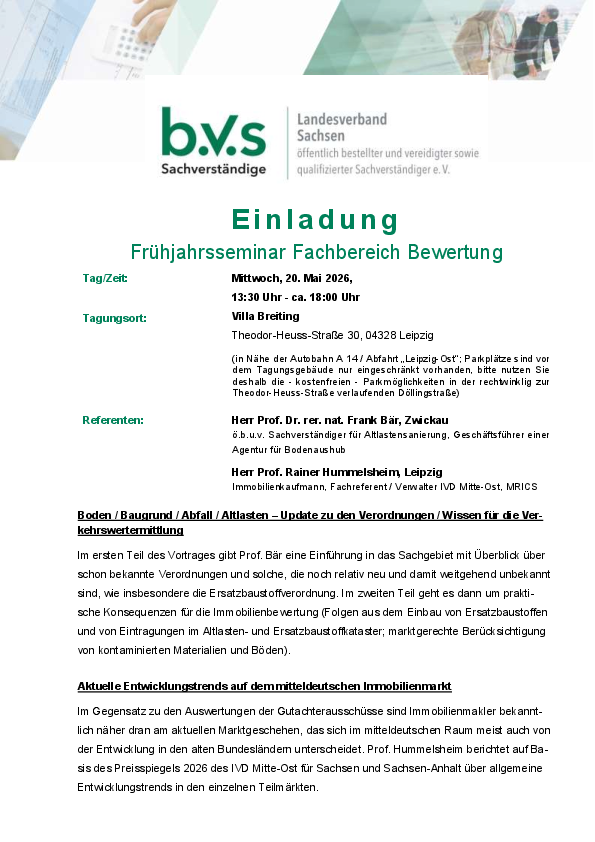 | Herr Prof. Dr. rer. nat. Frank Bär, Zwickau ö.b.u.v. Sachverständiger für Altlastensanierung, Geschäftsführer einer Agentur für Bodenaushub Herr Prof. Rainer Hummelsheim, Leipzig Immobilienkaufmann, Fachreferent / Verwalter IVD Mitte-Ost, MRICS |