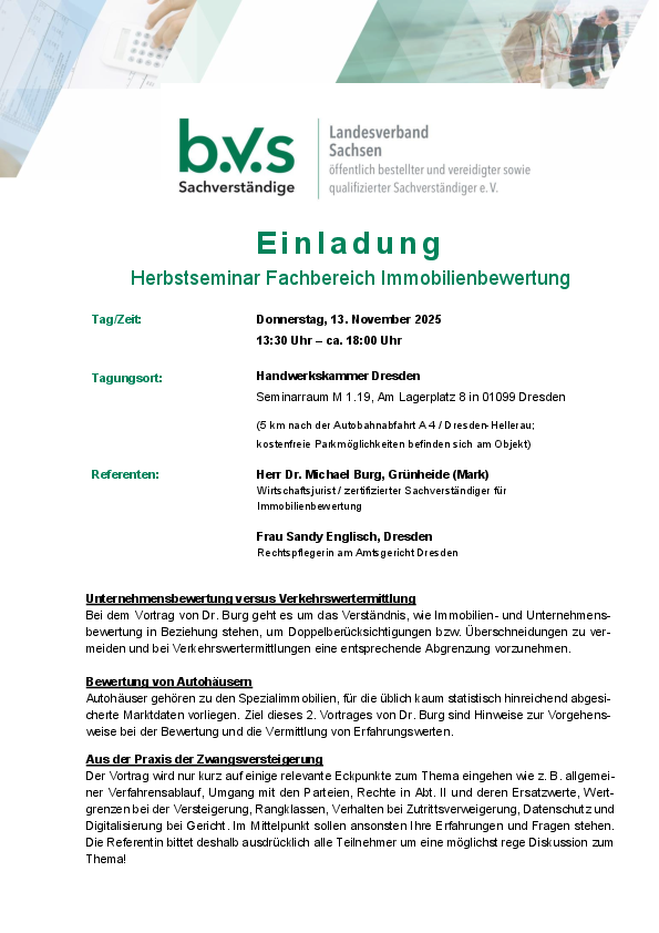 - Referenten: Dr. Michael Burg (Wirtschaftsjurist, Sachverständiger für Immobilienbewertung), Sandy Englisch (Rechtspflegerin am Amtsgericht Dresden)